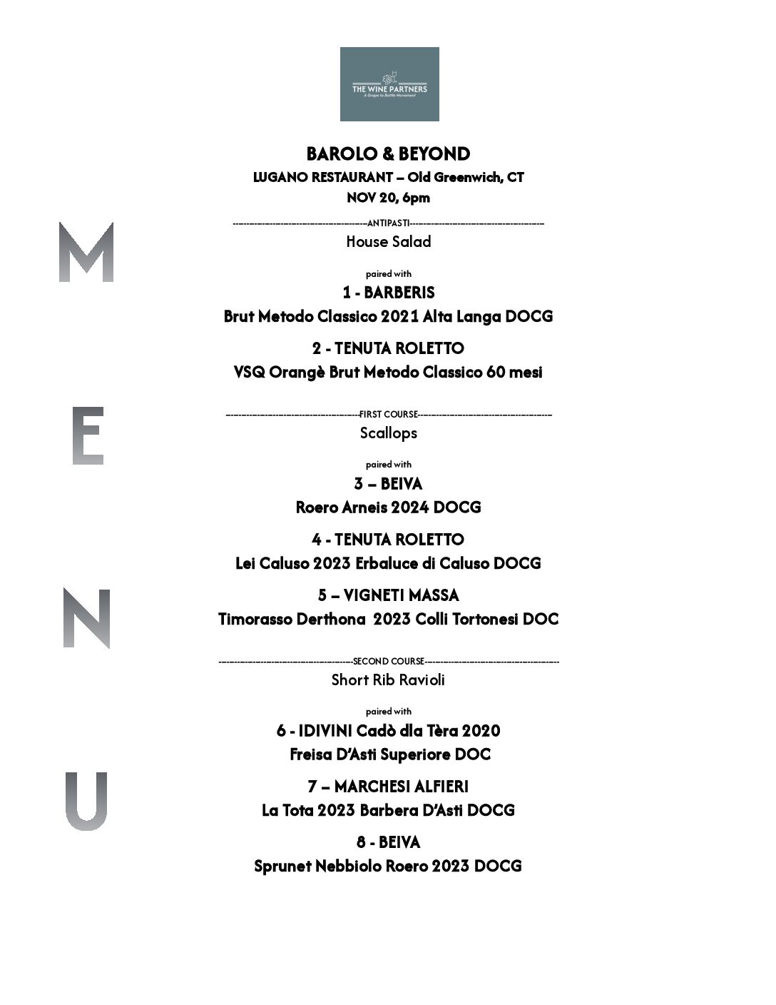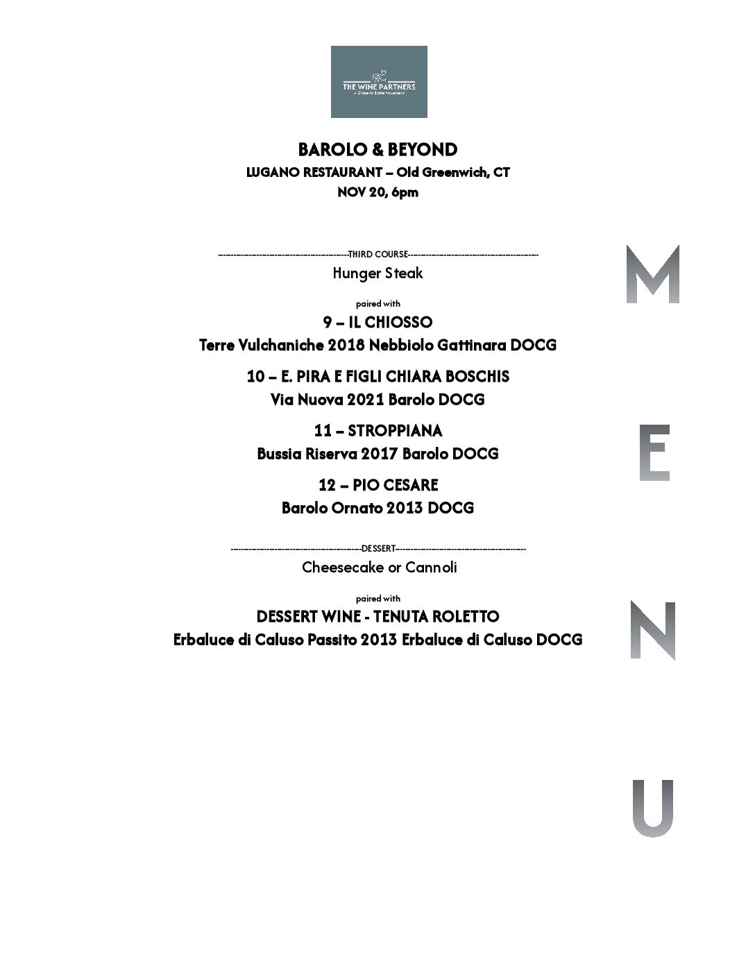 A guided tasting, wine service, and masterclass of 12 Piedmont wines (plus a dessert wine) curated by The Wine Partners team